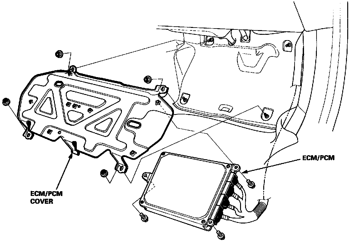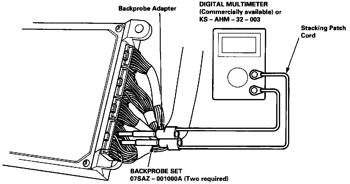 If the inspection for a particular code requires voltage or resistance checks at the ECM/PCM connectors, remove the right door sill molding. Pull the carpet back to expose the ECM/PCM. Unbolt the ECM/PCM cover, and connect the backprobe sets and a digital multimeter as described below. Check the system according to the procedure described for the appropriate code(s) listed on the following page