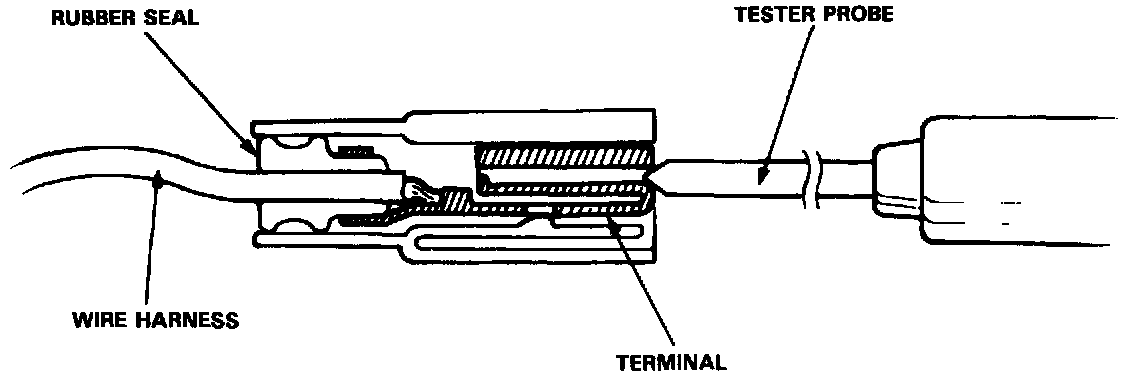 - Bring the tester probe into contact with the terminal from the terminal side of wire harness connectors in the engine compartment. For female connectors, lust touch lightly with the tester probe and do not insert the probe.