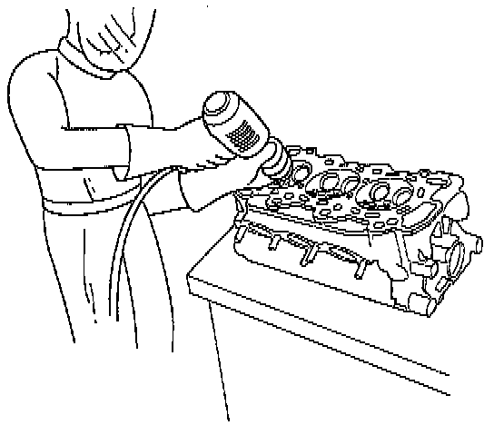 4. Working from the camshaft side, use the driver and an air hammer to drive the guide about 2 mm (0.1 inch) towards the combustion chamber. This will knock off some of the carbon and make removal easier.
