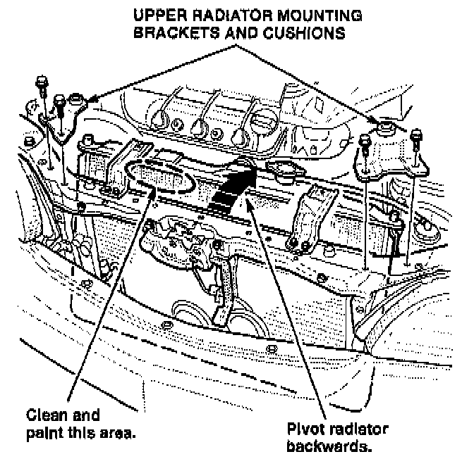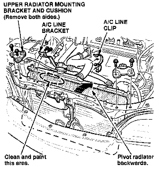 3. Remove the A/C line bracket mounting bolts from the radiator bulkhead. Pivot the bracket up and back.