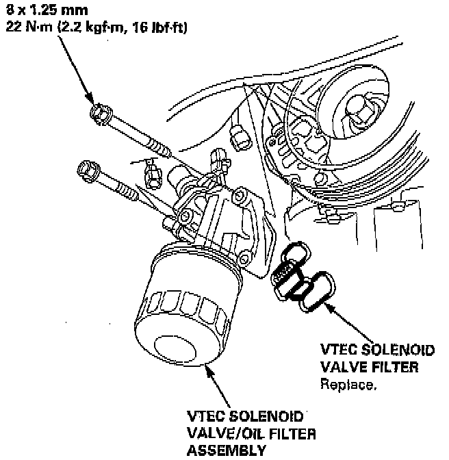 3. If the resistance is within specifications, remove the VTEC solenoid valve/oil filter assembly from the oil pump, and check the VTEC solenoid valve filter for clogging.