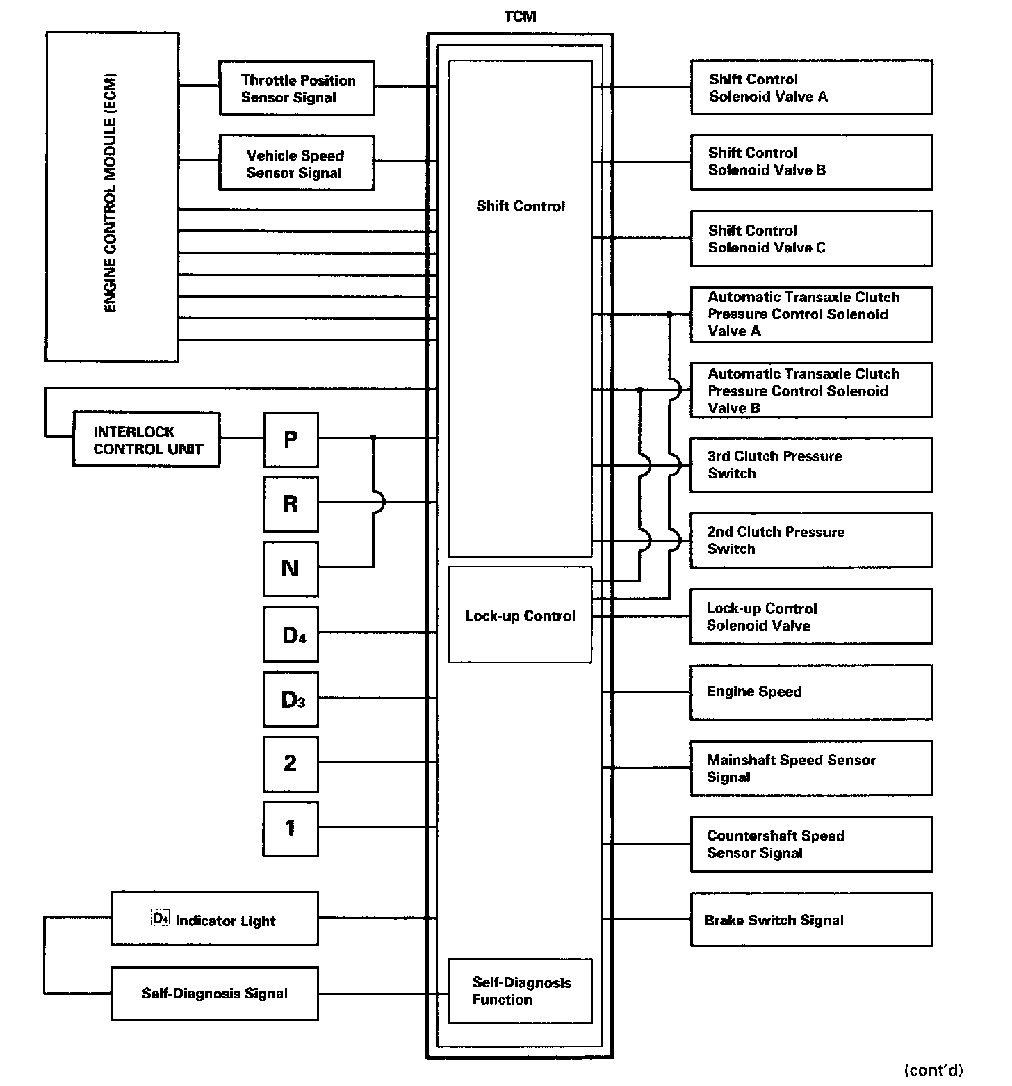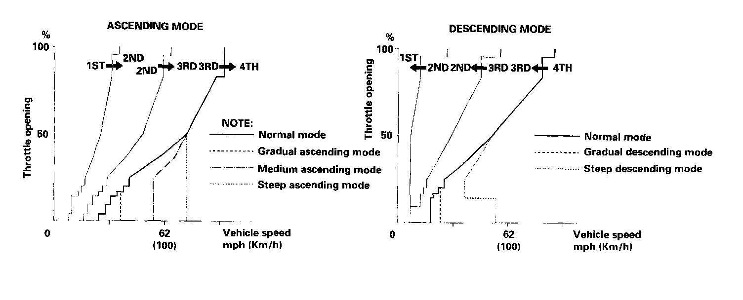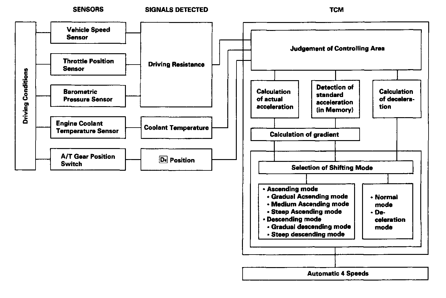 The Transmission Control Module (TCM) compares actual driving conditions with driving conditions memorized in the TCM, based on the input from the Vehicle Speed Sensor (VSS), the throttle position sensor, the engine coolant temperature sensor, the barometric pressure sensor, the brake switch signal and the shift lever position signal, to control shifting while the vehicle is ascending or descending a slope, or reducing speed.
