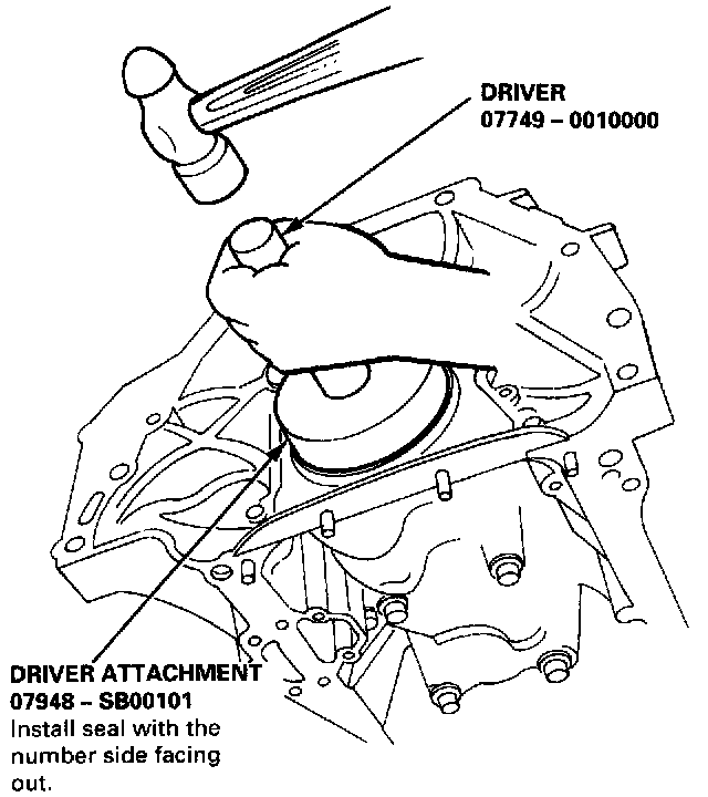 OIL: The seal surface on the block should be dry. Apply a light coat of grease to the crankshaft and to the lip of seal.1. Using the special tool, drive in the timing pulley end seal until the driver bottoms against the oil pump.