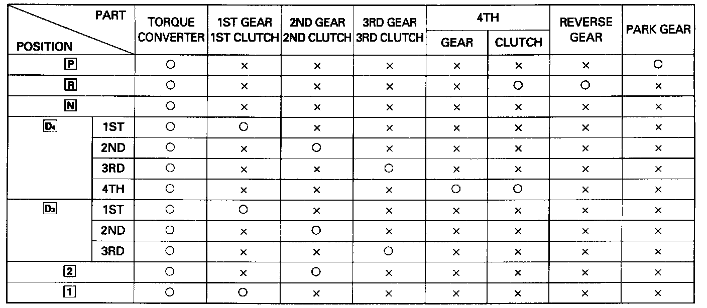 In [D4] or [D3] position, the optimum gear is automatically selected from the 1st, 2nd, 3rd and 4th gears, according to conditions such as the balance between the throttle opening (engine loading) and vehicle speed.