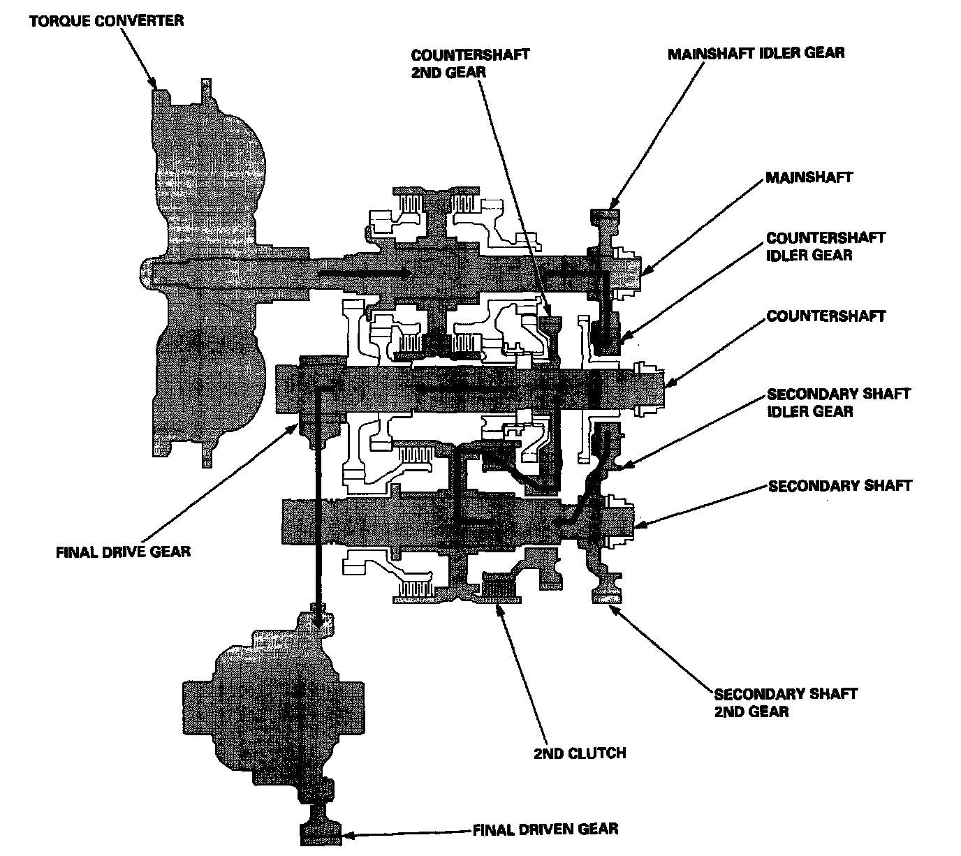 1. Hydraulic pressure is applied to the 2nd clutch, then the 2nd clutch engages the secondary shaft 2nd gear with the secondary shaft.