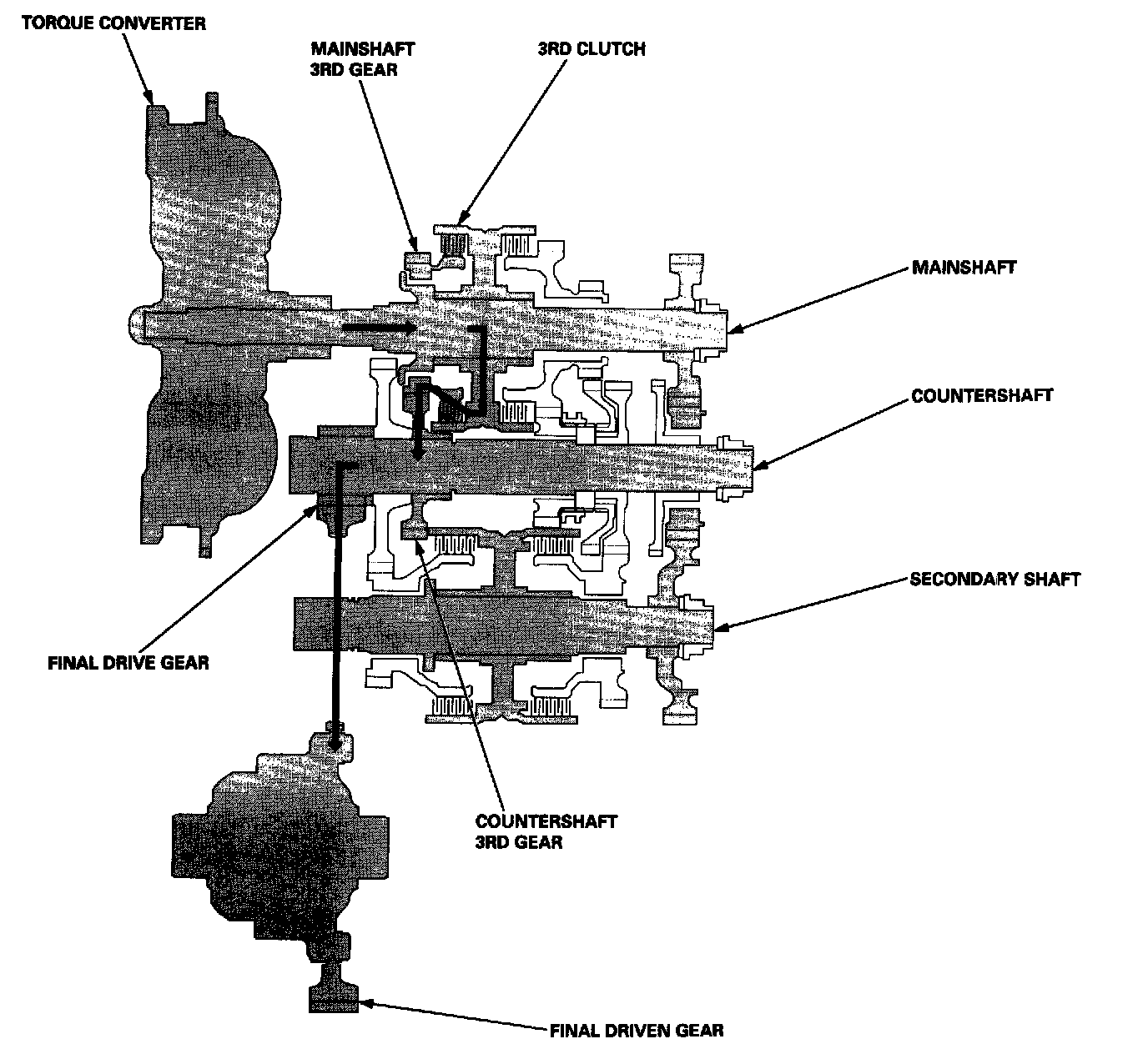 1. Hydraulic pressure is applied to the 3rd clutch, then the 3rd clutch engages the mainshaft 3rd gear with the mainshaft.