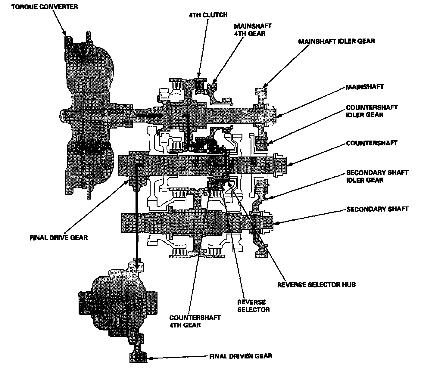 Engine power transmitted from the torque converter drives the mainshaft idler gear, the countershaft idler gear, and the secondary shaft idler gear, but hydraulic pressure is not applied to the clutches. Power is not transmitted to the countershaft. The countershaft 4th gear is engaged with the reverse selector hub and the countershaft by the reverse selector, when the shift lever is shifted in [N] position from [D4] position. The countershaft reverse gear is engaged when shifted from [R] position.