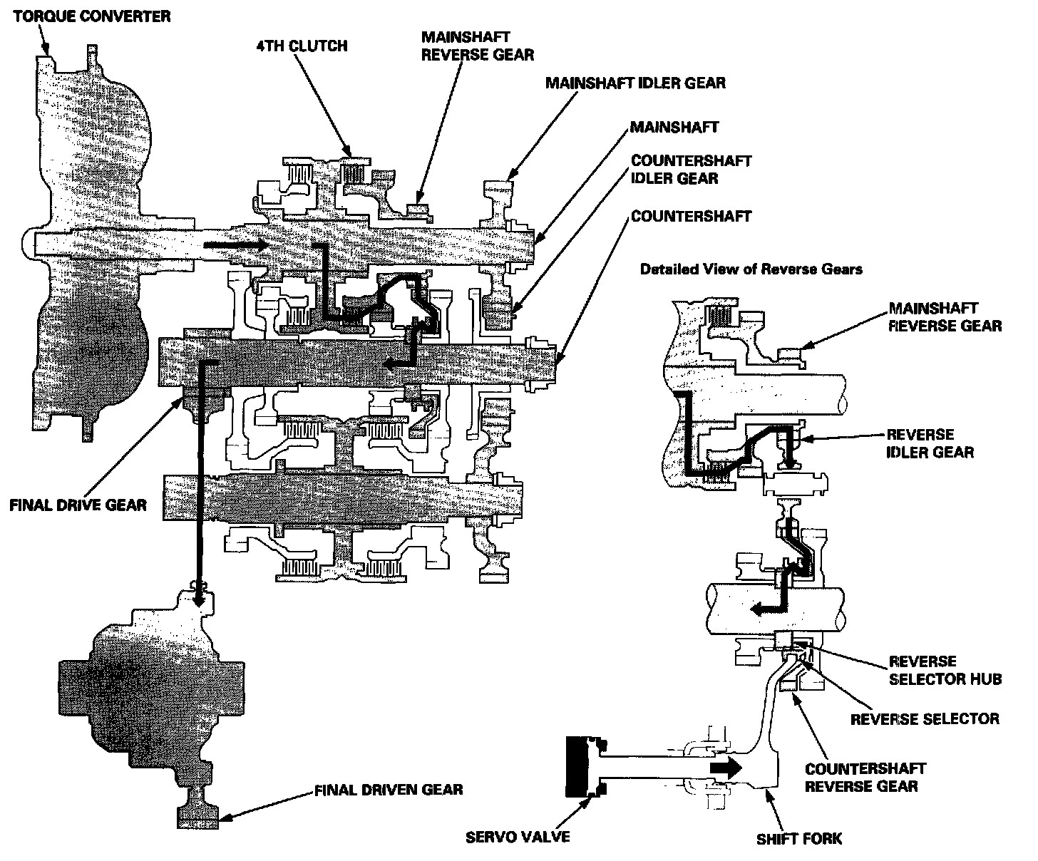 1. Hydraulic pressure is applied to the servo valve to engage the reverse selector with the countershaft 4th gear while the shift lever is in the forward range ([D4], [D3], [2] and [1] position).