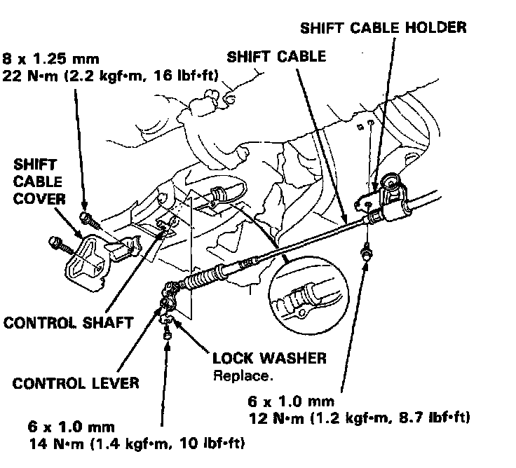 6. Remove the control lever from the control shaft, then remove the shift cable. Take care not to bend the cable when removing/installing it.