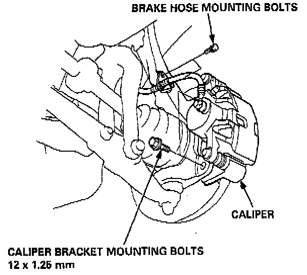 6. Remove the caliper bracket mounting bolts, and hang the caliper to one side.