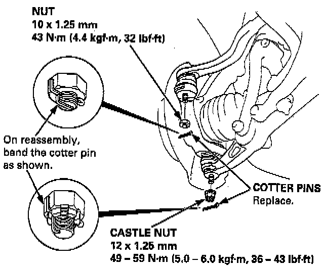 3. Install the knuckle on the upper arm, then tighten the castle nut and install a new cotter pin.