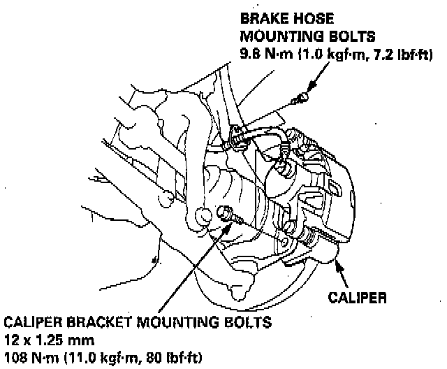 7. Install the brake caliper with the caliper bracket mounting bolts.