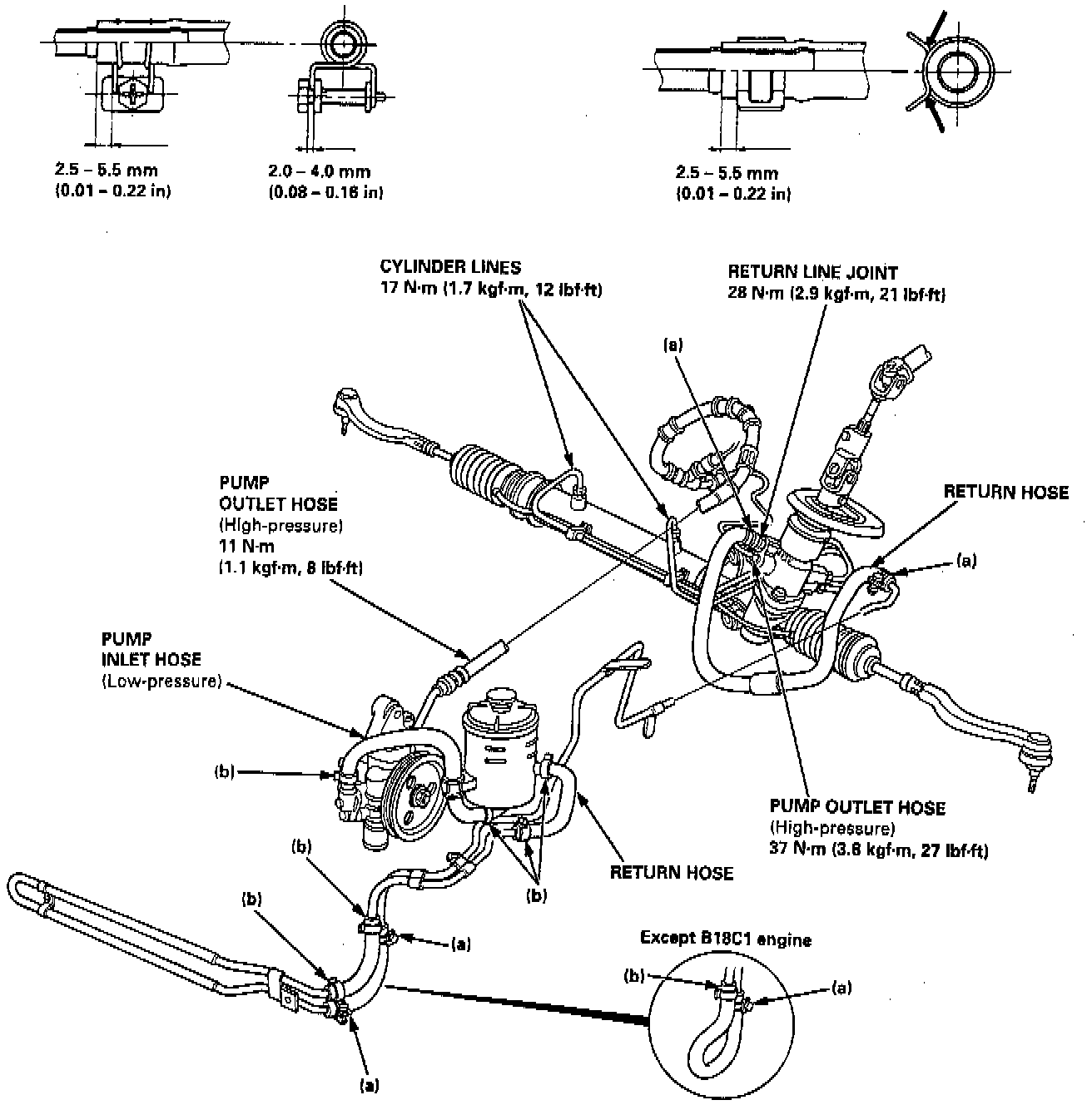 - Connect each hose to the corresponding line securely until it contacts the stop on the line. Install the clamp or adjustable clamp at the specified distance from the hose end as shown.