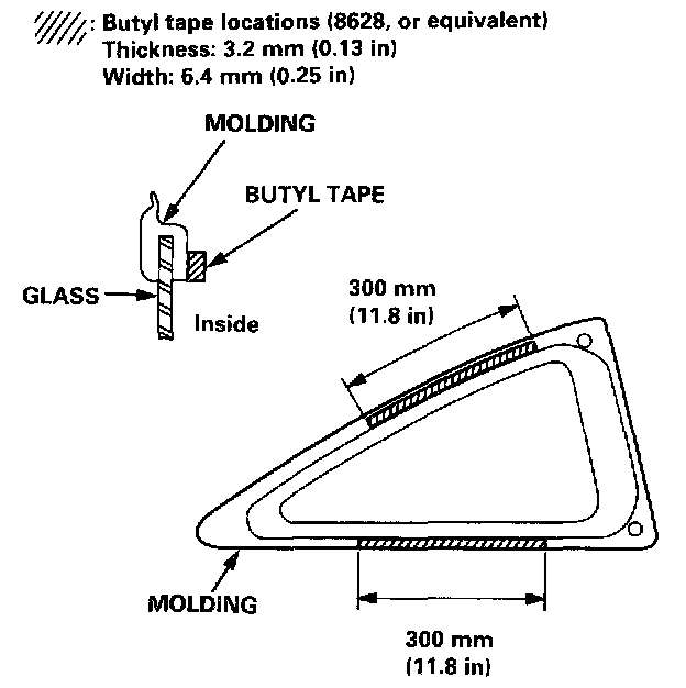 4. If the old quarter glass is to be reinstalled (and either of the clips are broken off the molding), apply a light coat of primer (C-100, or equivalent), then apply the butyl tape to the molding as shown.