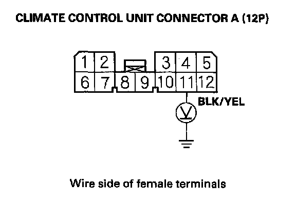 4. Measure the voltage between the No.11 terminal of the climate control unit connector A (12P) and body ground.