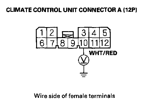6. Measure the voltage between the No.10 terminal of the climate control unit connector A (12P) and body ground.