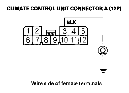 7. Check for continuity between the No.3 terminal of the climate control unit connector A (12P) and body ground.