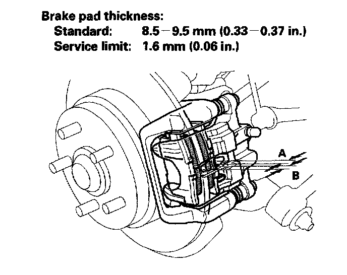 2. Check the thickness of the inner pad (A) and outer pad (B). Do not include the thickness of the backing plate.