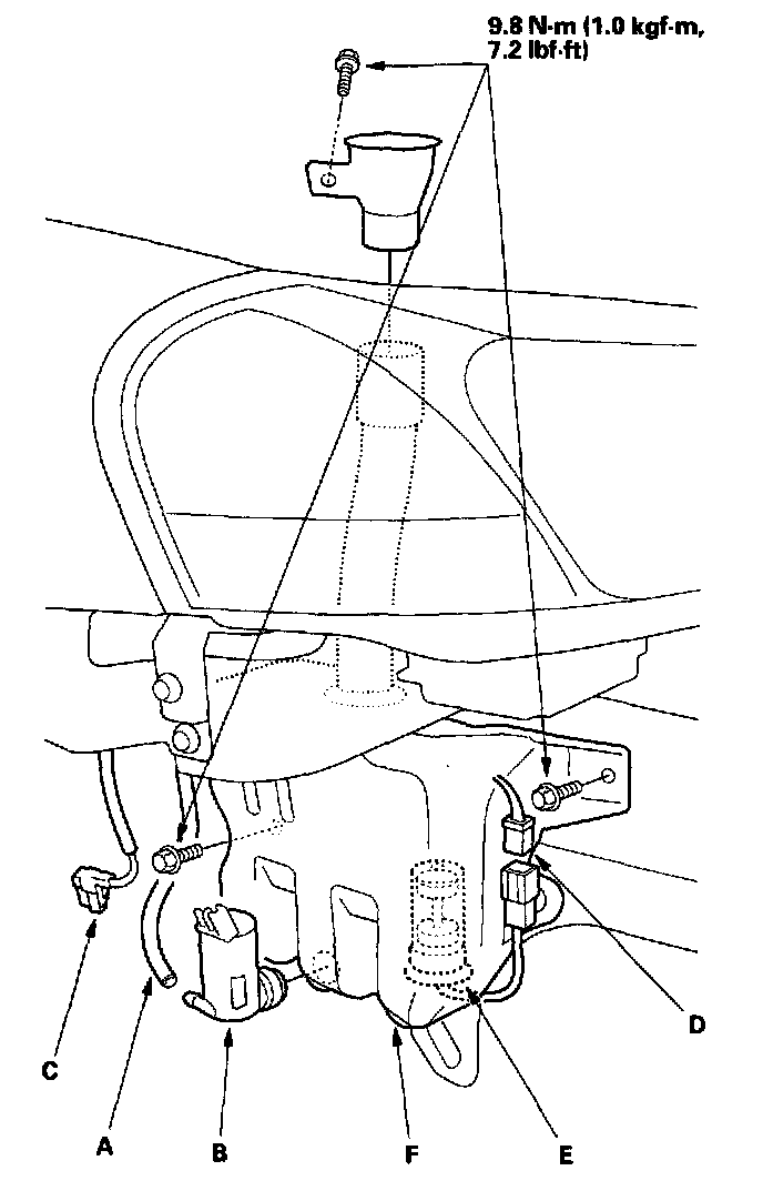 5. Remove the three bolts and washer reservoir (F).
