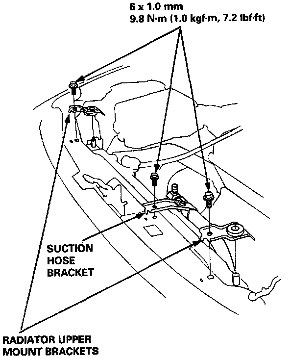 3. Remove the bolts and the radiator upper mount brackets, then remove the bolt from the suction hose bracket.