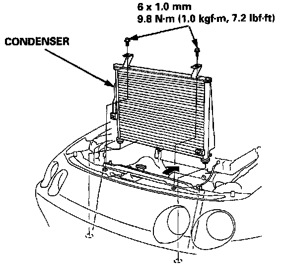 NOTE: Be careful not to damage the radiator and condenser fins when removing the condenser.