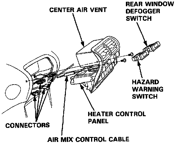 1. Disconnect the air mix control cable from the heater unit.2. Remove the rear window defogger switch and the hazard warning switch.