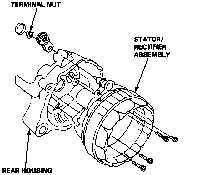 5. Separate the rear housing from the stator/rectifier assembly by removing the four screws and the terminal nut.