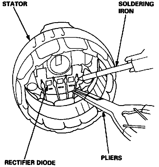 - To avoid damaging the diodes with heat, pinch the stator leads between pliers to carry heat OFF, and apply the soldering iron only long enough to separate the leads from the rectifier.