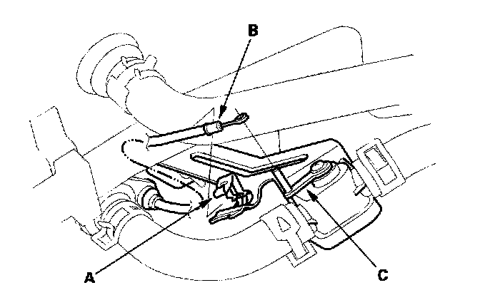 Heater Valve Cable Adjustment1. From under the hood, open the cable clamp (A), then disconnect the heater valve cable (B) from the heater valve arm (C).
