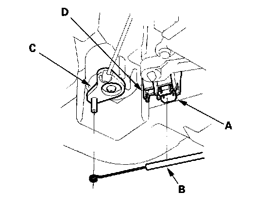 4. Attach the heater valve cable (B) to the air mix control linkage (C) as shown Hold the end of the heater valve cable housing against the stop (D), then snap the heater valve cable housing into the cable clamp (A).