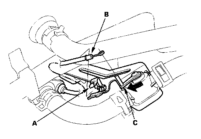 5. From under the hood, turn the heater valve arm (C) to the fully closed position as shown, and hold it Attach the heater valve cable (B) to the heater valve arm, and gently pull on the heater valve cable housing to take up any slack, then install the heater valve cable housing into the cable clamp (A).