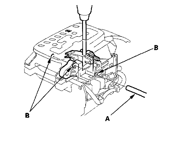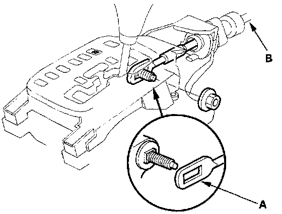 20. Insert a 6.0 mm (0.24 inch) pin (A) into the positioning hole (B) on the shift lever bracket base through the positioning hole on the shift lever assembly. The shift lever is secured in the [R] position.