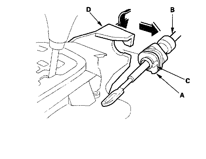 6. Rotate the socket holder (A) on the shift cable (B) a quarter turn; the tab (C) on the socket holder will be in the opening of the shift lever bracket base (D). Then slide the holder to remove the shift cable from the shift lever bracket base (D).