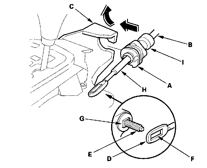 21. Align the socket holder (A) on the shift cable (B) with the slot in the bracket base (C), then slide the holder into the base. Install the shift cable end (D) over the mounting stud (E) by aligning its square hole (F) with the square fitting (G) at the bottom of the stud. Rotate the holder a quarter turn to secure the shift cable. Do not install the shift cable by twisting the shift cable guide (H) and damper (1).