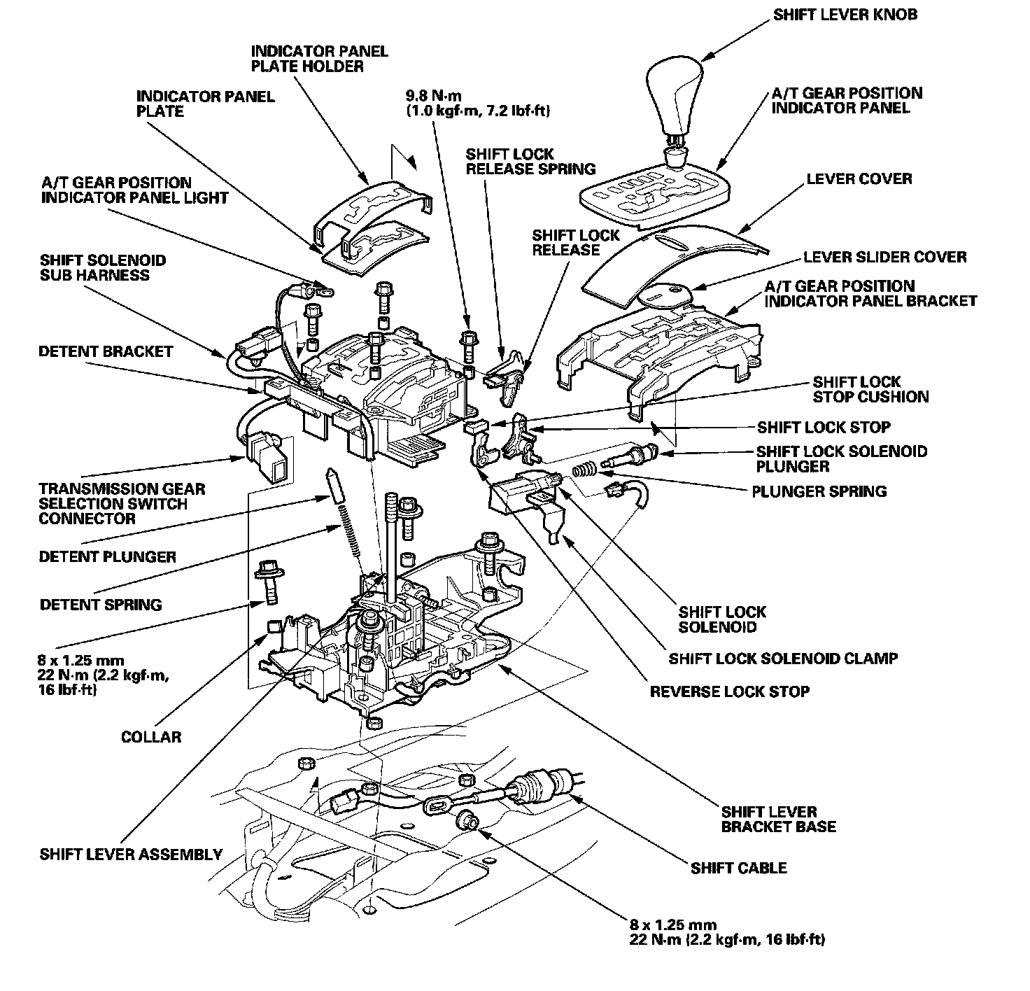 - Movable parts of the shift lock/reverse lock mechanism. Sliding surfaces on the opening of the indicator panel and panel holder. Sliding surfaces on the detent plate. Contact surfaces between of the shift lever assembly and the shift lock stop. Detent plunger and detent spring.