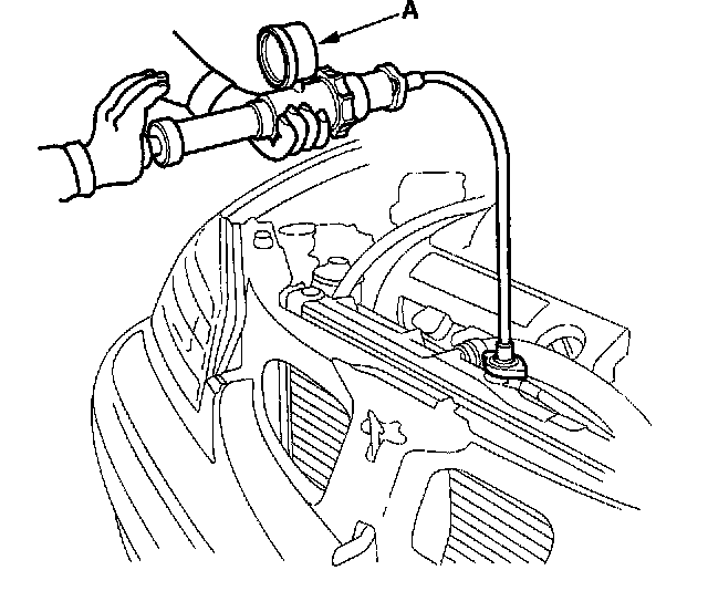 2. Attach a commercially available pressure tester (A) to the radiator and apply a pressure of 93 - 123 kPa (0.95 - 1.25 kgf/cm2, 14 - 18 psi).