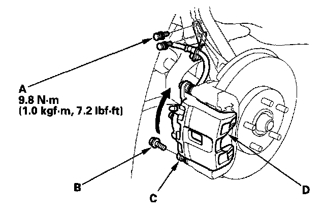 3. Remove the flange bolt (B) while holding the pin A (C) with a wrench being careful not to damage the pin boot, and pivot the caliper (D) up out of the way. Check the hoses and pin boots for damage and deterioration.