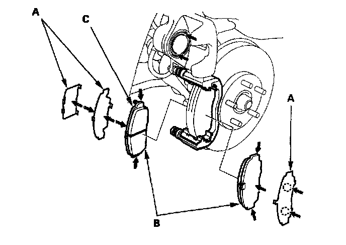 11. Install the brake pads and pad shims correctly. Install the pad with the wear indicator (C) on the inside.