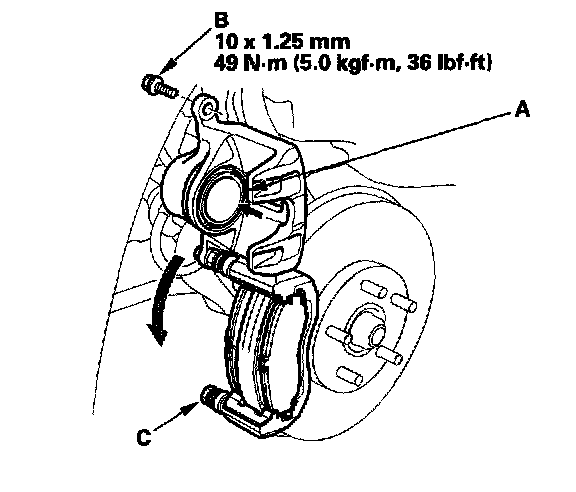 13. Pivot the caliper down into the position. Install the flange bolt (B), and torque it to the specified torque while holding the pin (C) with a wrench. Be careful not to damage the pin boot. Check the hoses and pin boots for damage and deterioration.