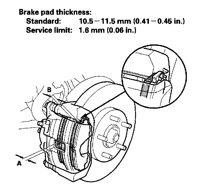 2. Check the thickness of the inner pad (A) and outer pad (B). Do not include the thickness of the backing plate.