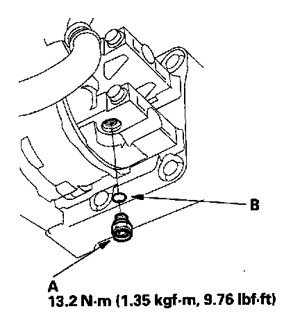 2. Remove the relief valve (A) and the O-ring (B). Plug the opening to keep foreign matter from entering the system and the compressor oil from running out.
