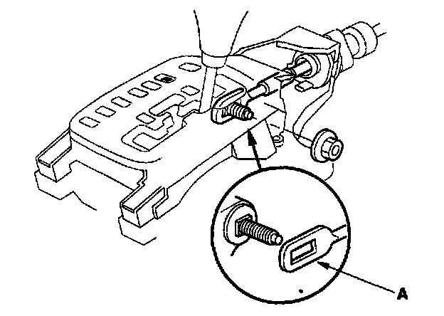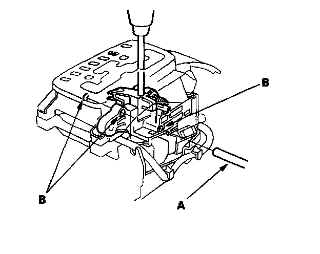 20. Insert a 6.0 mm (0.24 inch) pin (A) into the positioning hole (B) on the shift lever bracket base through the positioning hole on the shift lever assembly. The shift lever is secured in the R Position.