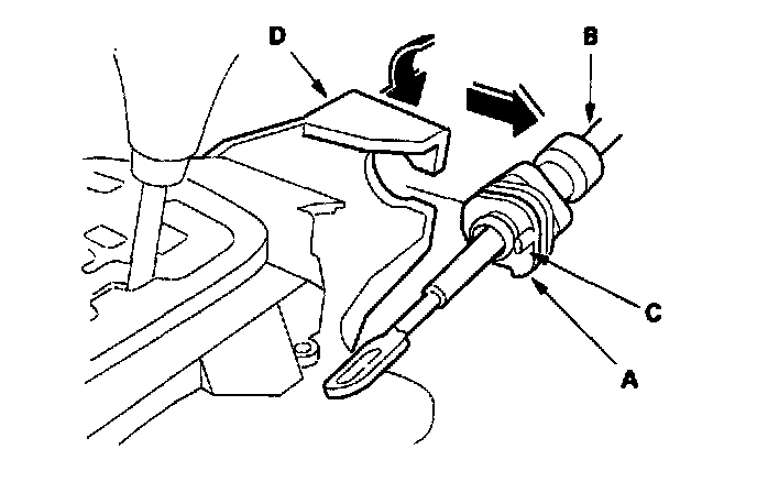 6. Rotate the socket holder (A) on the shift cable (B) a quarter turn; the tab (C) on the socket holder will be in the opening of the shift lever bracket base (D). Then slide the holder to remove the shift cable from the shift lever bracket base (D).