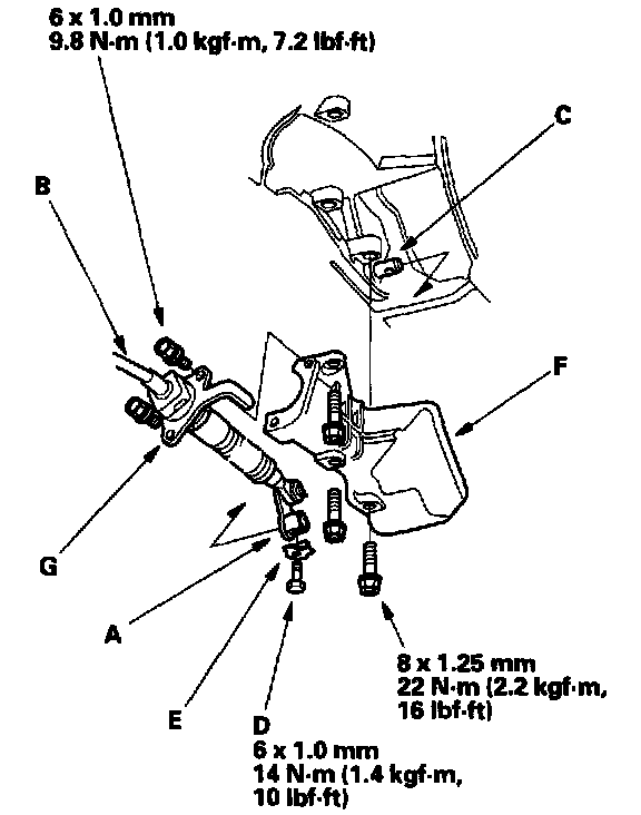 15. Install the shift cable cover (F), then install the shift cable holder (G) on the cover.
