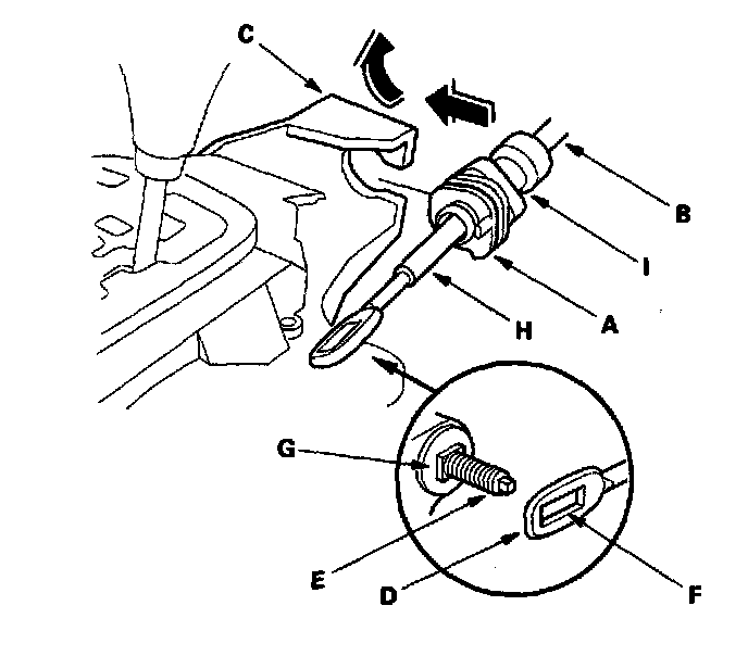 21. Align the socket holder (A) on the shift cable (B) with the slot in the bracket base (C), then slide the holder into the base. Install the shift cable end (D) over the mounting stud (E) by aligning its square hole (F) with the square fitting (G} at the bottom of the stud. Rotate the holder a quarter turn to secure the shift cable. Do not install the shift cable by twisting the shift cable guide (H) and damper (I).