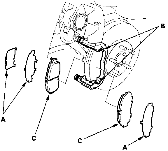 4. Remove the pad shims (A), pad retainers (B), and pads (C).