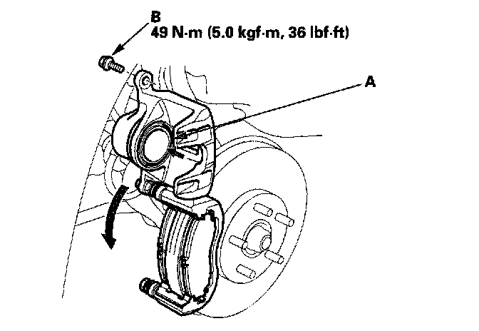 13. Pivot the caliper down into position. Being careful not to damage the pin boot, install the caliper bolt (B), and torque it to proper specification.