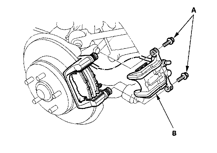 3. Remove the brake hose from the suspension arm by removing the mounting bolt, then remove the two caliper bolts (A) and caliper (B) from the bracket. Thoroughly clean the outside of the caliper to prevent dust and dirt from entering inside. Support the caliper with a piece of wire so that it does not hang from the brake hose.