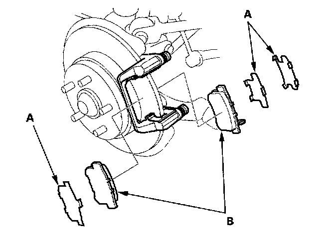4. Remove the pad shims (A) and brake pads (B).