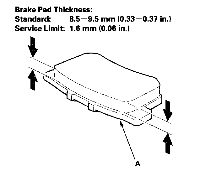 5. Using vernier calipers, measure the thickness of each brake pad lining. Measurement does not include pad backing plate (A) thickness.